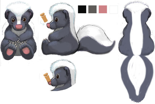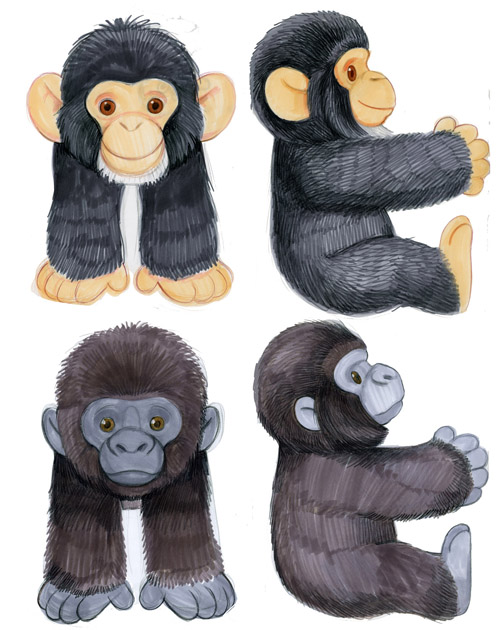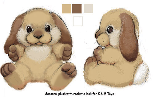Color schematics (marker) and some of the finished plush toys for K & M's "Cuddlekins Baby Animals" line.